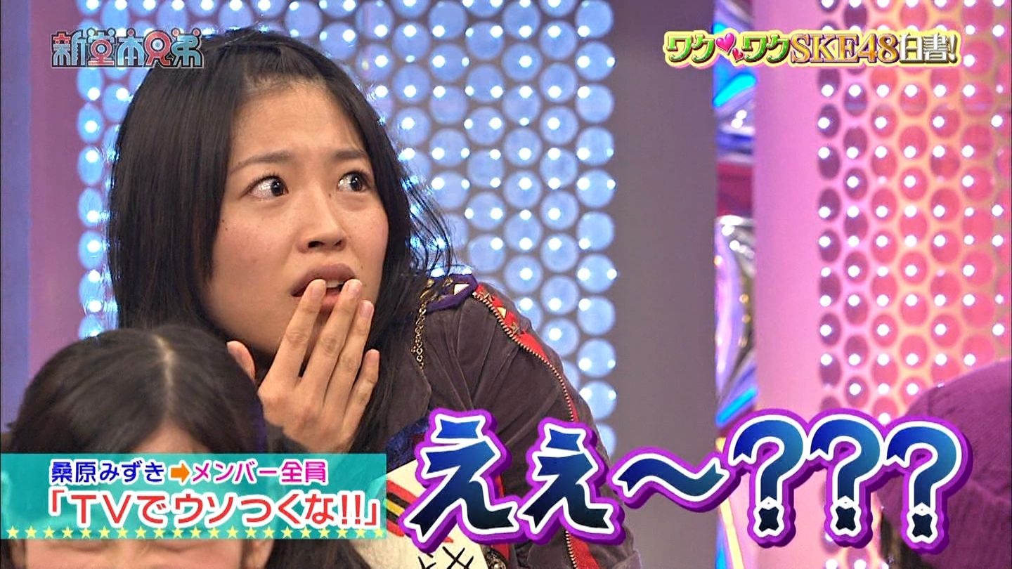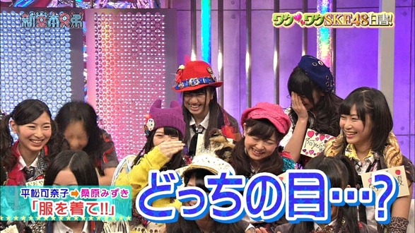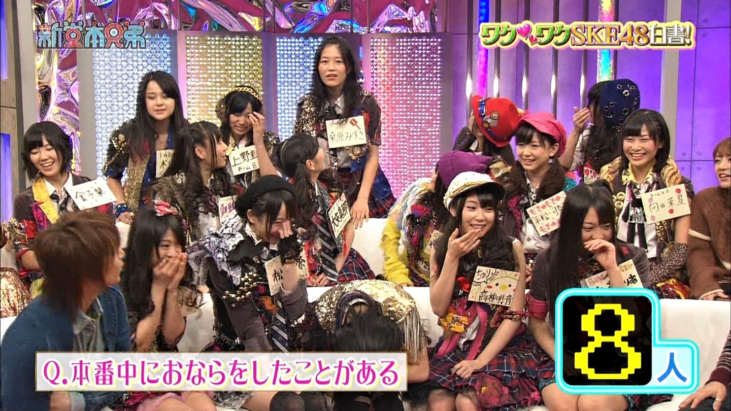 Still on the topic, Mizuki begs the members to stop telling lies while on TV. As the hosts wonder what she’s talking about, she takes us back to the first episode (or was it 2nd) of SKE48 no Sekai Joshi in which the 48 members were asked to push the button if they had ever heard anyone pass gas. There were 36 out of 48 who pushed that button. Mizuki says that she has only done it like once (admits she has farted at least once) but when she said (back then) that when dancing, the feel to pass gas is strong, everyone was pointing fingers as if she was the gas master or something.