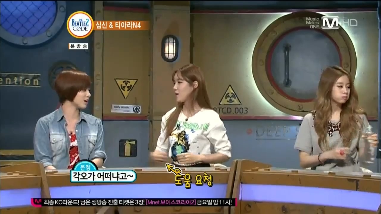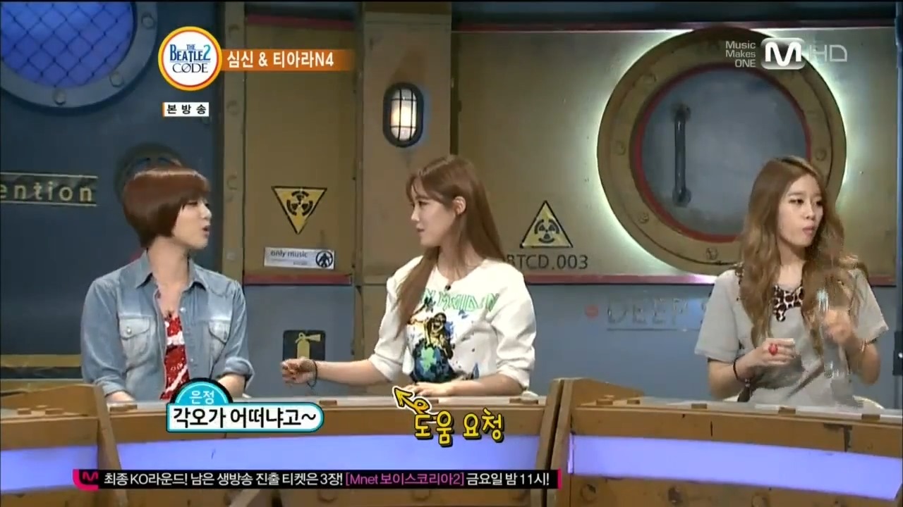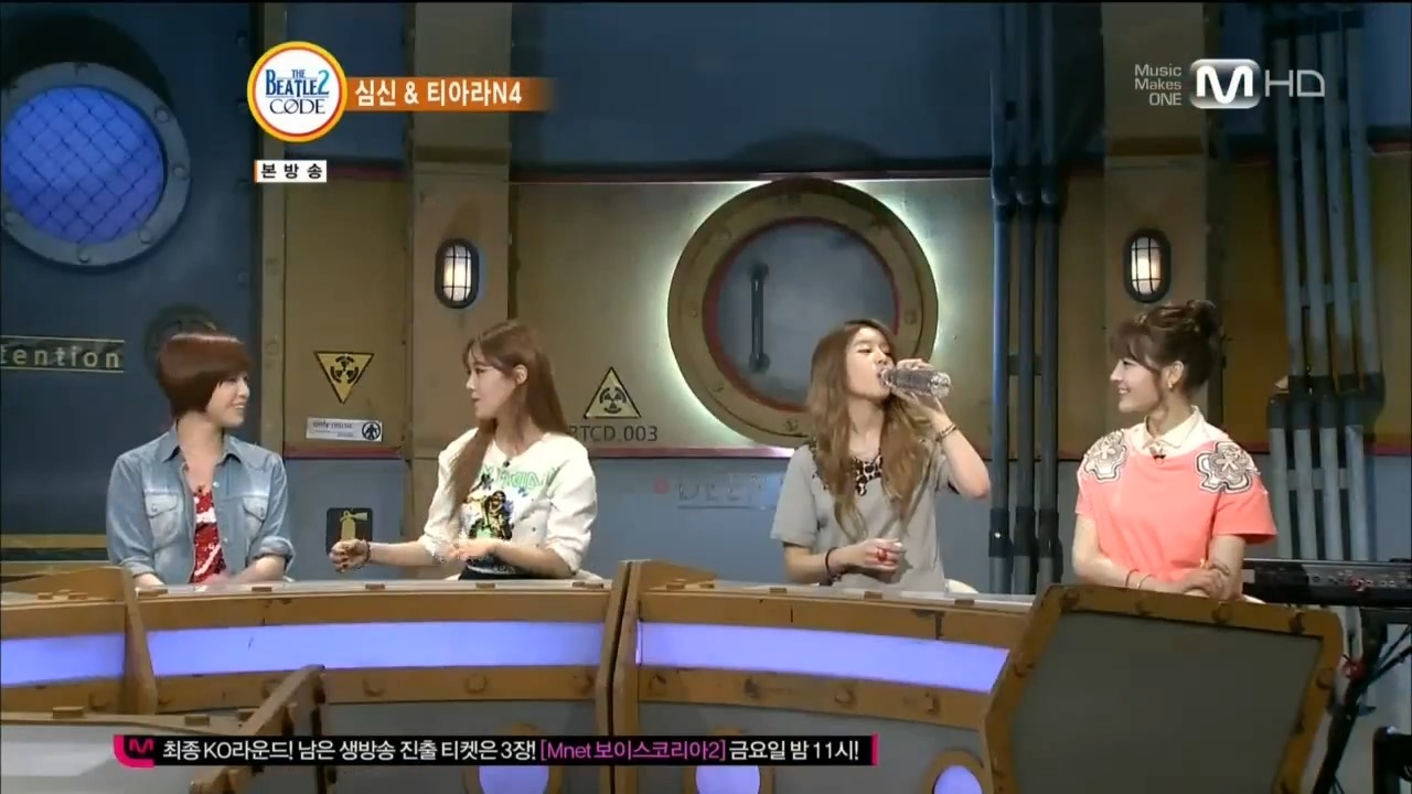There I sit, watching some Mars-speak show with N4 (T-ara’s Eunjung, Hyomin, Jiyeon and Areum) as guests. I don’t understand a word but I can guess the gist of the convos thanks to Mars’ emoticons on their TV shows, when Jiyeon reaches under the desk to grab a bottle of water.