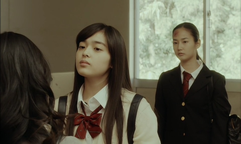 Any way Yuki and Ayako first meet in the movie at the mentioned rooftop, though meeting isn’t the corrected term. As Yuki chillaxes on the roof top listening to some music, out of the door walks Ayako. She only acknowledges Yuki’s presence in the proximity but that was it. We learn that she was asked to come up here by a popular boy who confesses to Ayako right there while Yuki watches. Feeling that she might be intruding, or maybe that her personal space was being invaded, Yuki leaves the two. As she leaves, three of their classmates stop her and it seems they were stalking said guy and one of them is head over heels for him. This of course means one thing, Ayako is now an enemy and thus starts the bullying.