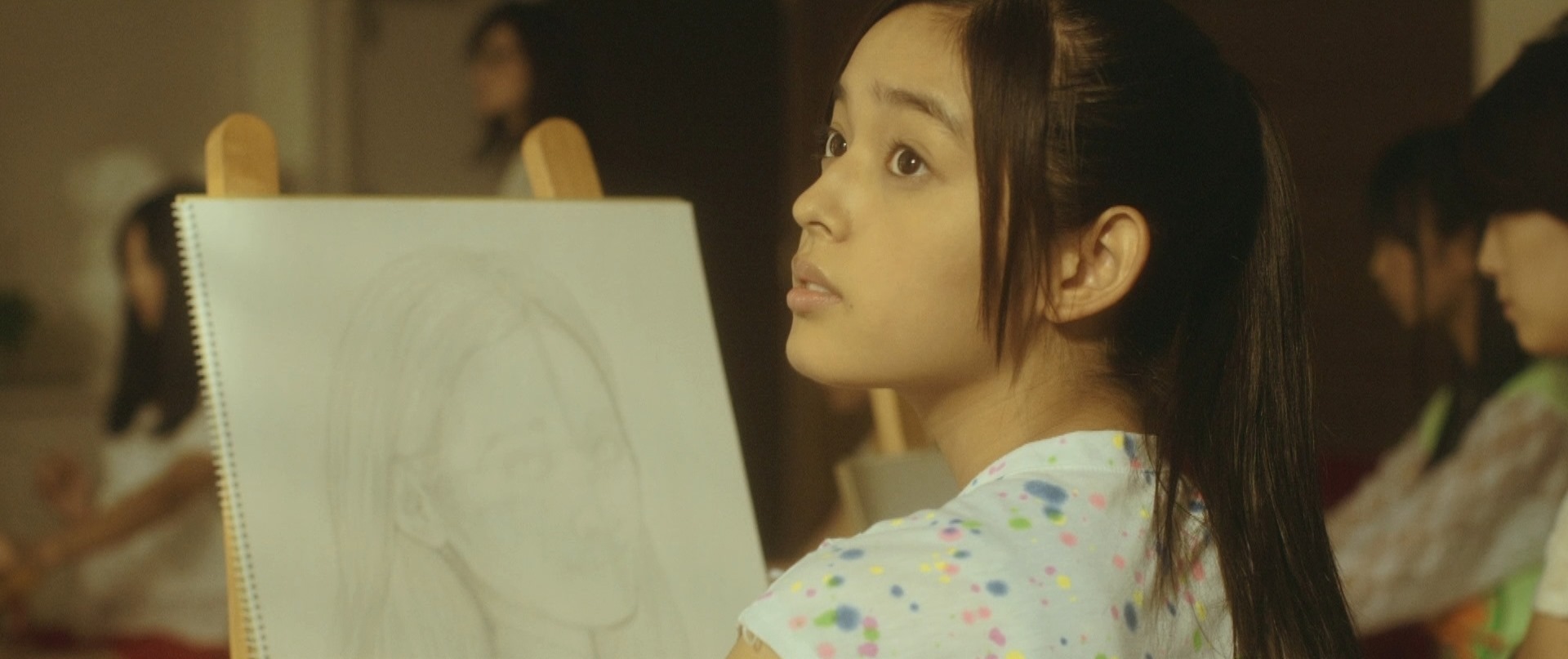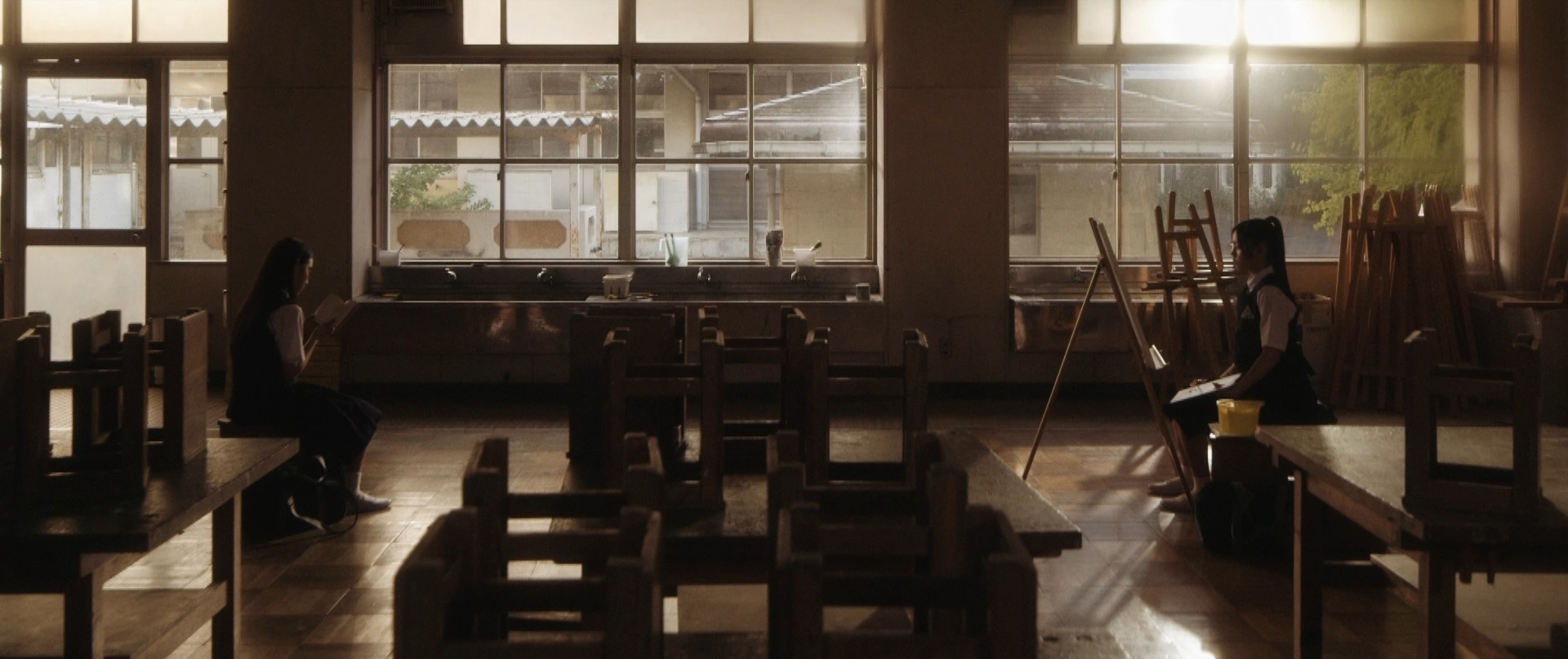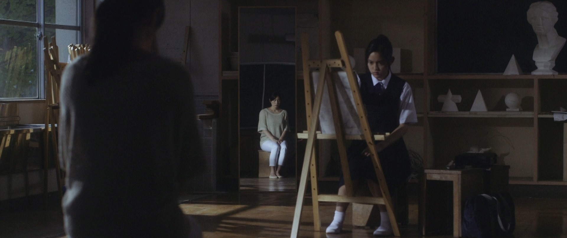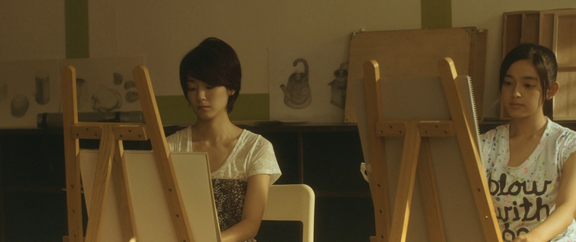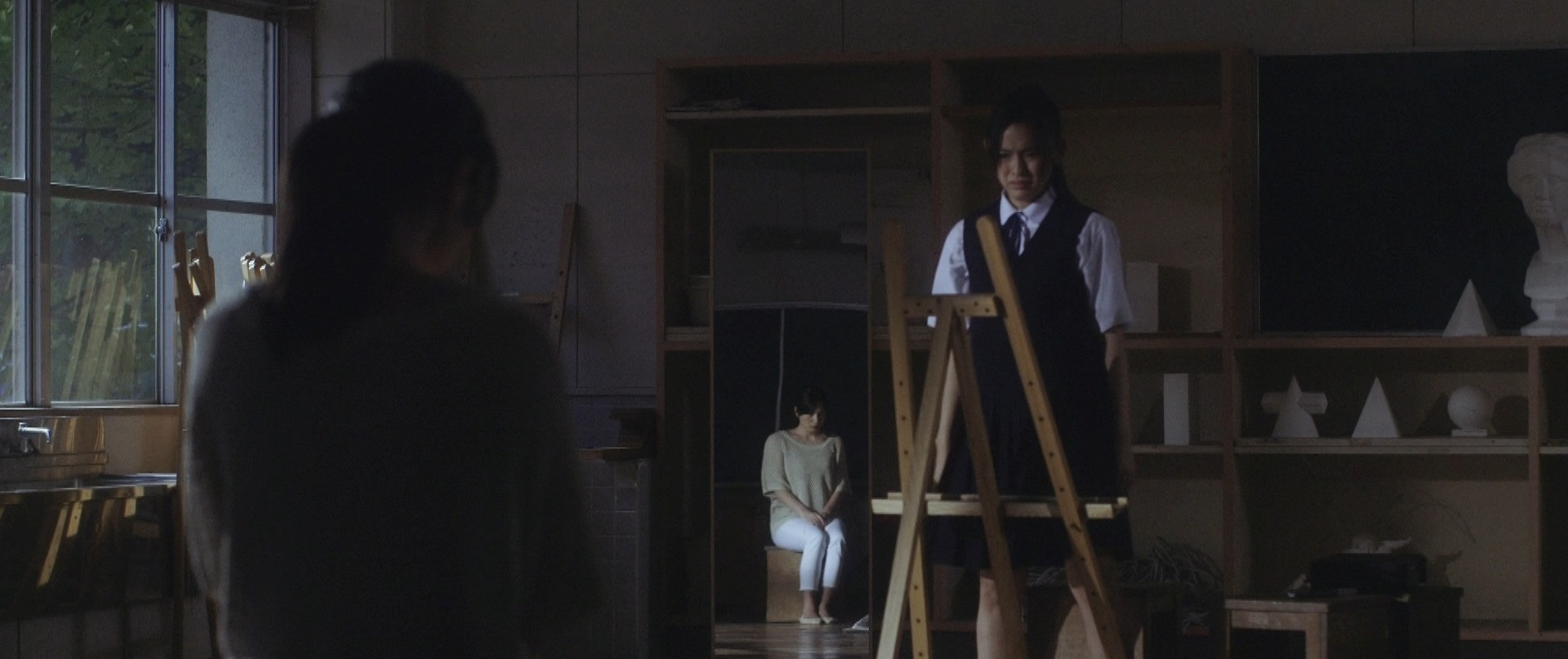 That was the beginning of the movie! Not even six minutes later when Takane and Mika were back at school, Takane was preparing her art equipment in the art classroom getting ready for what seemed to be their usual routine of Mika sitting and posing for Takane to paint her portrait. After placing the rough sketch up on the stand, Takane proceeds to lovingly caress the sketch and as I saw this I thought that Mika was not in the room. I was expecting Takane to jump like a cat caught stealing fish when Mika entered the room but that would have been so cliché. As Takane put on the protective apron, she turned around and froze in motion, something had caught her attention. Cut to Mika on the other side of the room, examining one of the sculptures looking oblivious to Takane lovingly caressing a sketch of her. I wonder if Takane had actually forgotten that Mika was around! We cut back to Takane who is watching her in silence with that look on her face once again. Seriously the tension in that look, in that room could be felt all the way back here in the real world.
