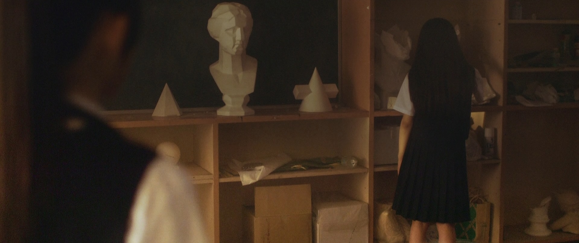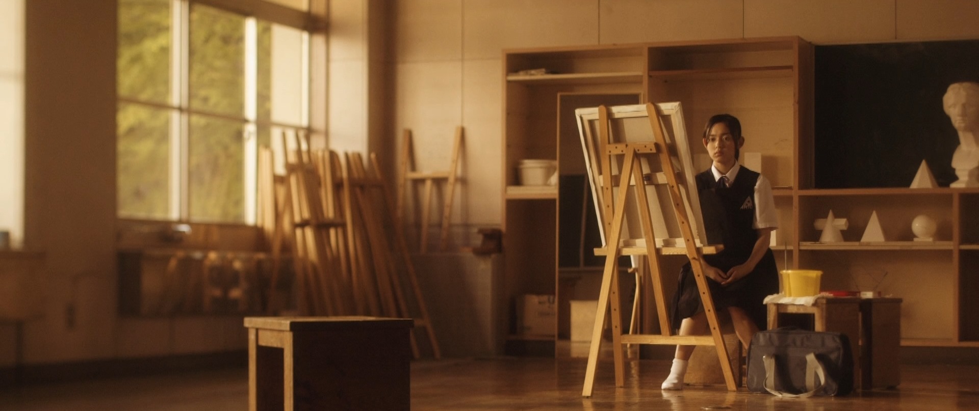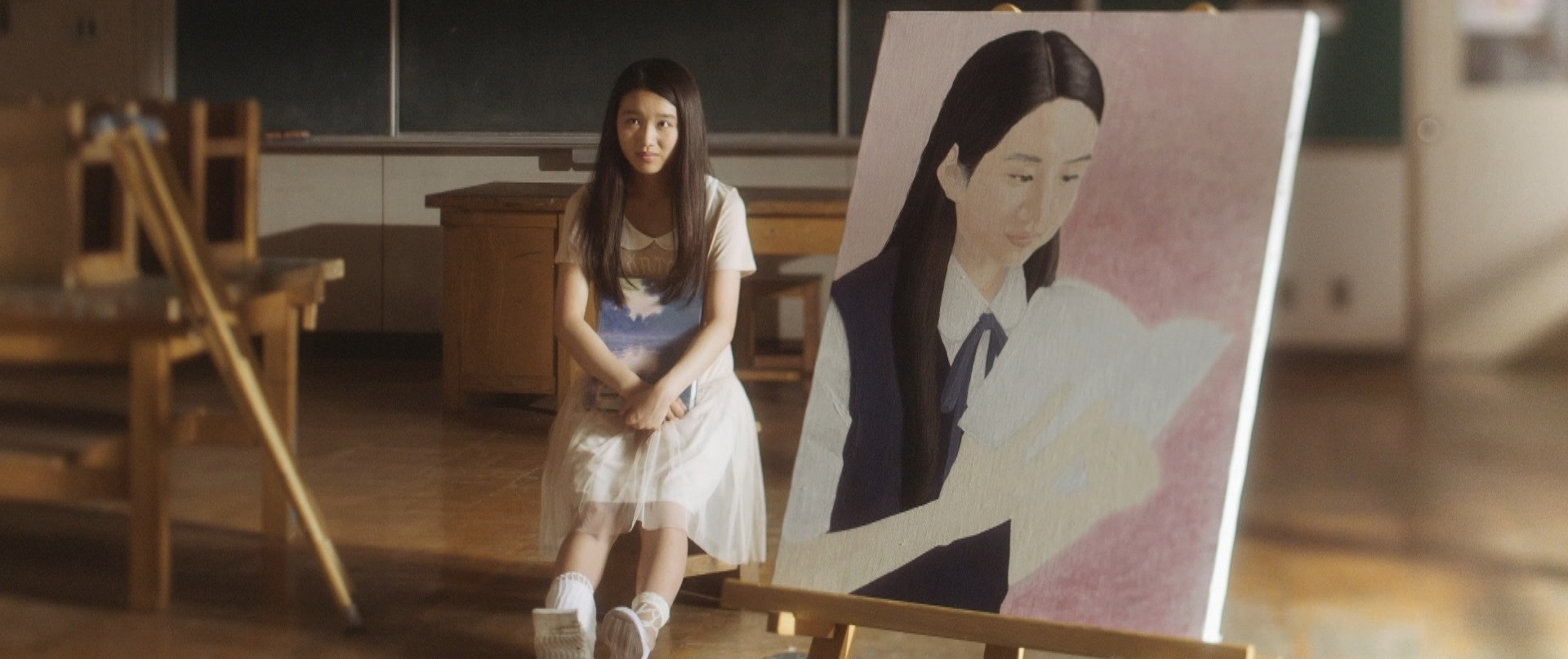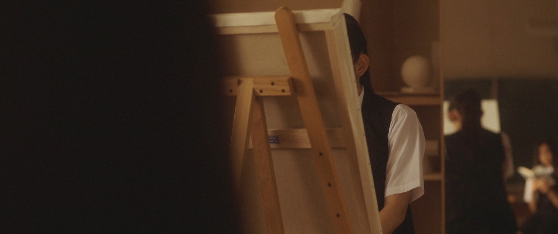 That was the beginning of the movie! Not even six minutes later when Takane and Mika were back at school, Takane was preparing her art equipment in the art classroom getting ready for what seemed to be their usual routine of Mika sitting and posing for Takane to paint her portrait. After placing the rough sketch up on the stand, Takane proceeds to lovingly caress the sketch and as I saw this I thought that Mika was not in the room. I was expecting Takane to jump like a cat caught stealing fish when Mika entered the room but that would have been so cliché. As Takane put on the protective apron, she turned around and froze in motion, something had caught her attention. Cut to Mika on the other side of the room, examining one of the sculptures looking oblivious to Takane lovingly caressing a sketch of her. I wonder if Takane had actually forgotten that Mika was around! We cut back to Takane who is watching her in silence with that look on her face once again. Seriously the tension in that look, in that room could be felt all the way back here in the real world.