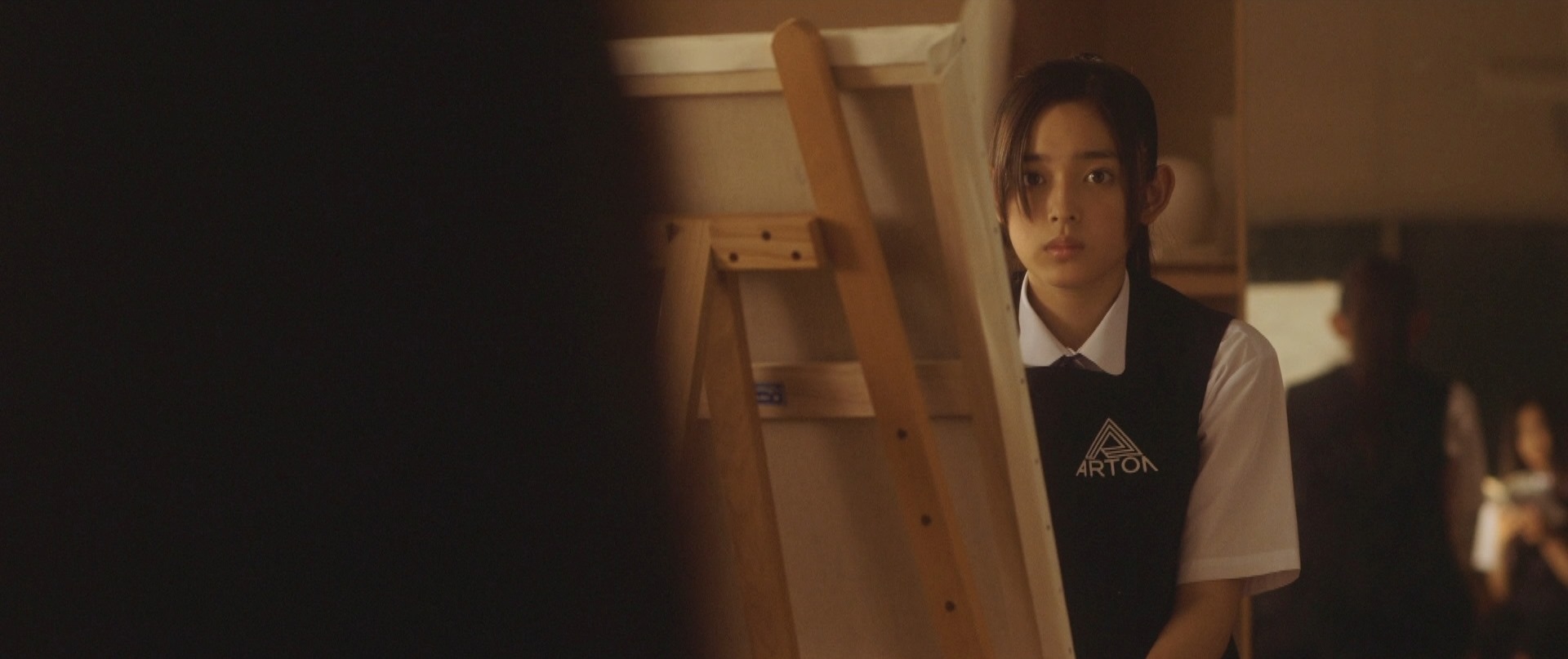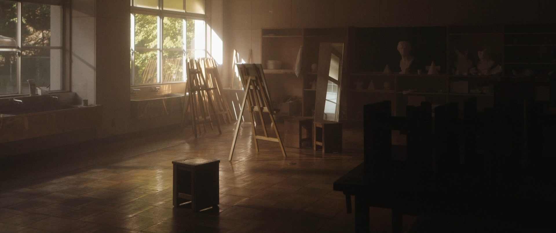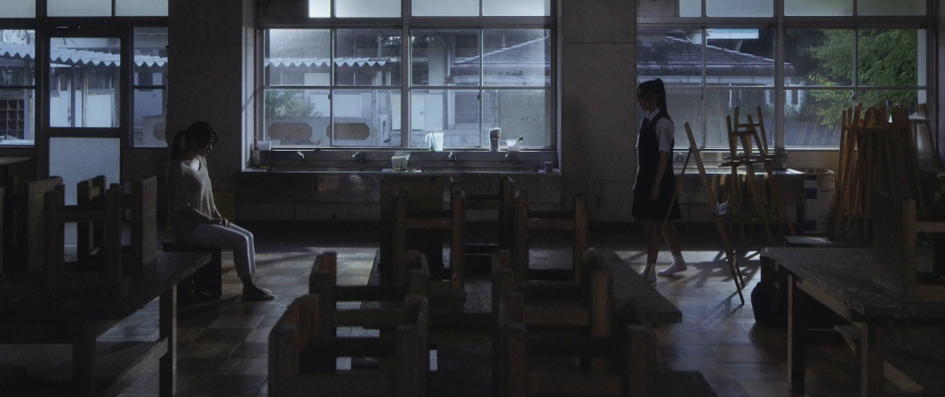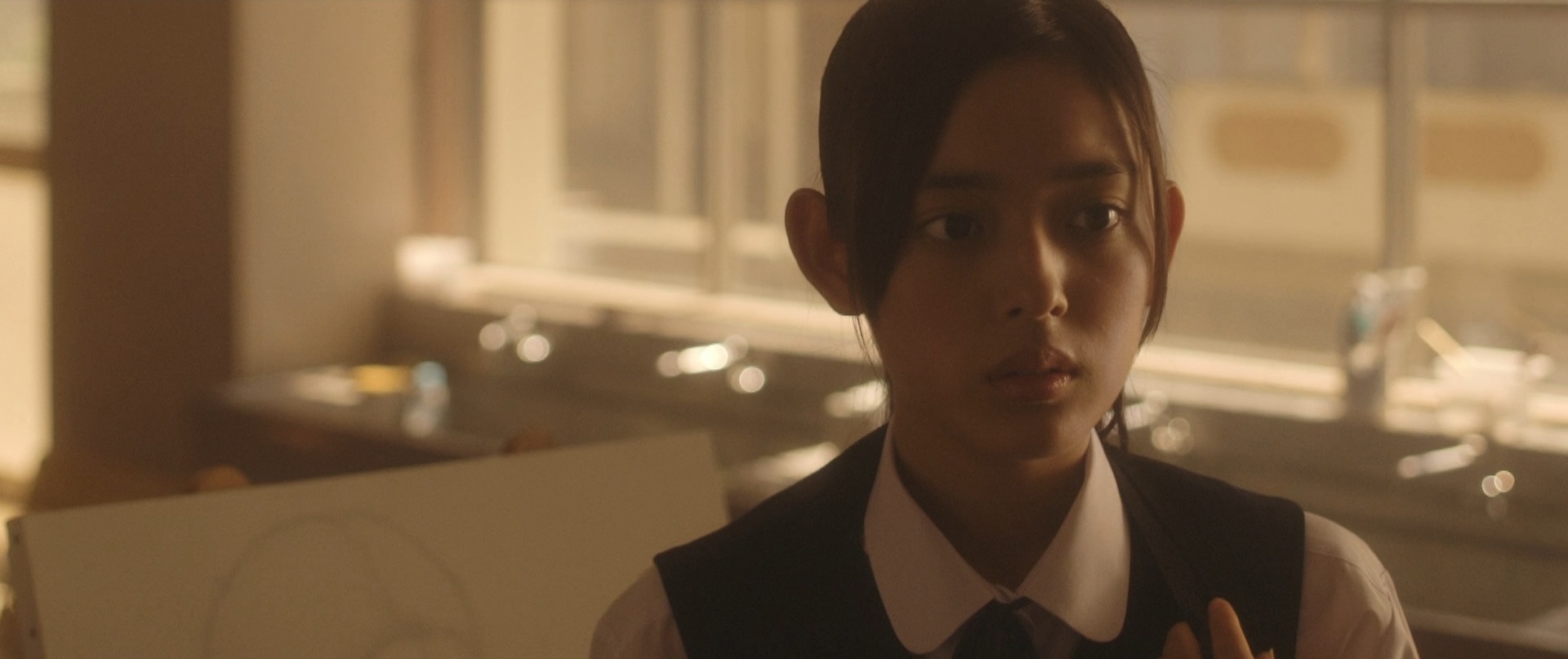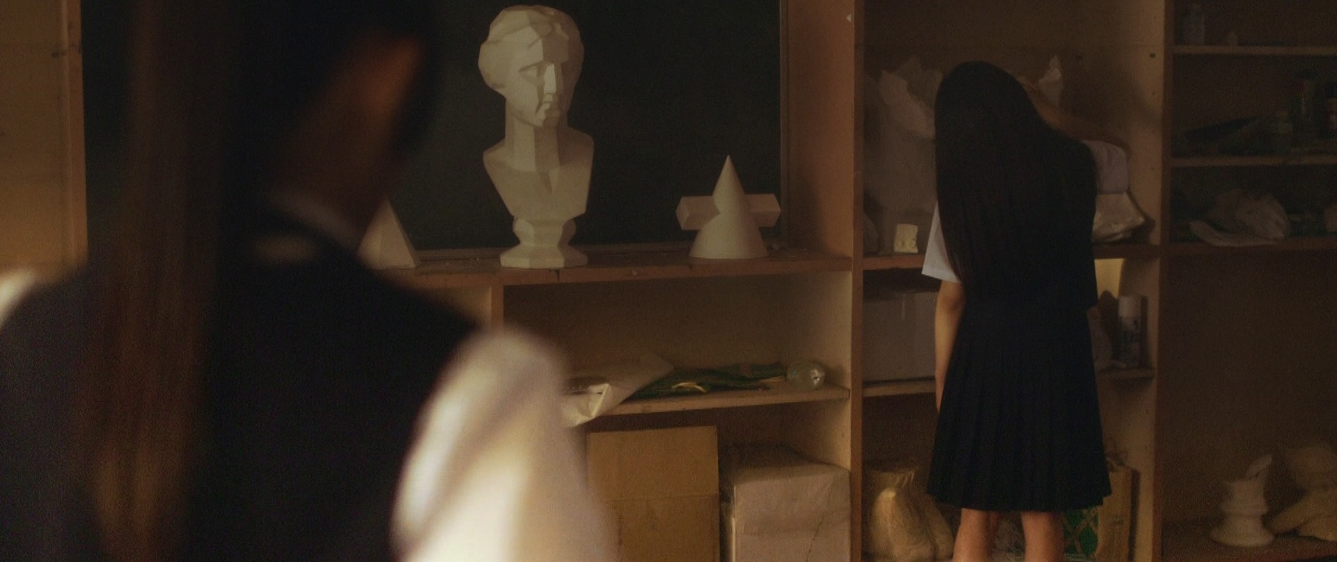That was the beginning of the movie! Not even six minutes later when Takane and Mika were back at school, Takane was preparing her art equipment in the art classroom getting ready for what seemed to be their usual routine of Mika sitting and posing for Takane to paint her portrait. After placing the rough sketch up on the stand, Takane proceeds to lovingly caress the sketch and as I saw this I thought that Mika was not in the room. I was expecting Takane to jump like a cat caught stealing fish when Mika entered the room but that would have been so cliché. As Takane put on the protective apron, she turned around and froze in motion, something had caught her attention. Cut to Mika on the other side of the room, examining one of the sculptures looking oblivious to Takane lovingly caressing a sketch of her. I wonder if Takane had actually forgotten that Mika was around! We cut back to Takane who is watching her in silence with that look on her face once again. Seriously the tension in that look, in that room could be felt all the way back here in the real world.