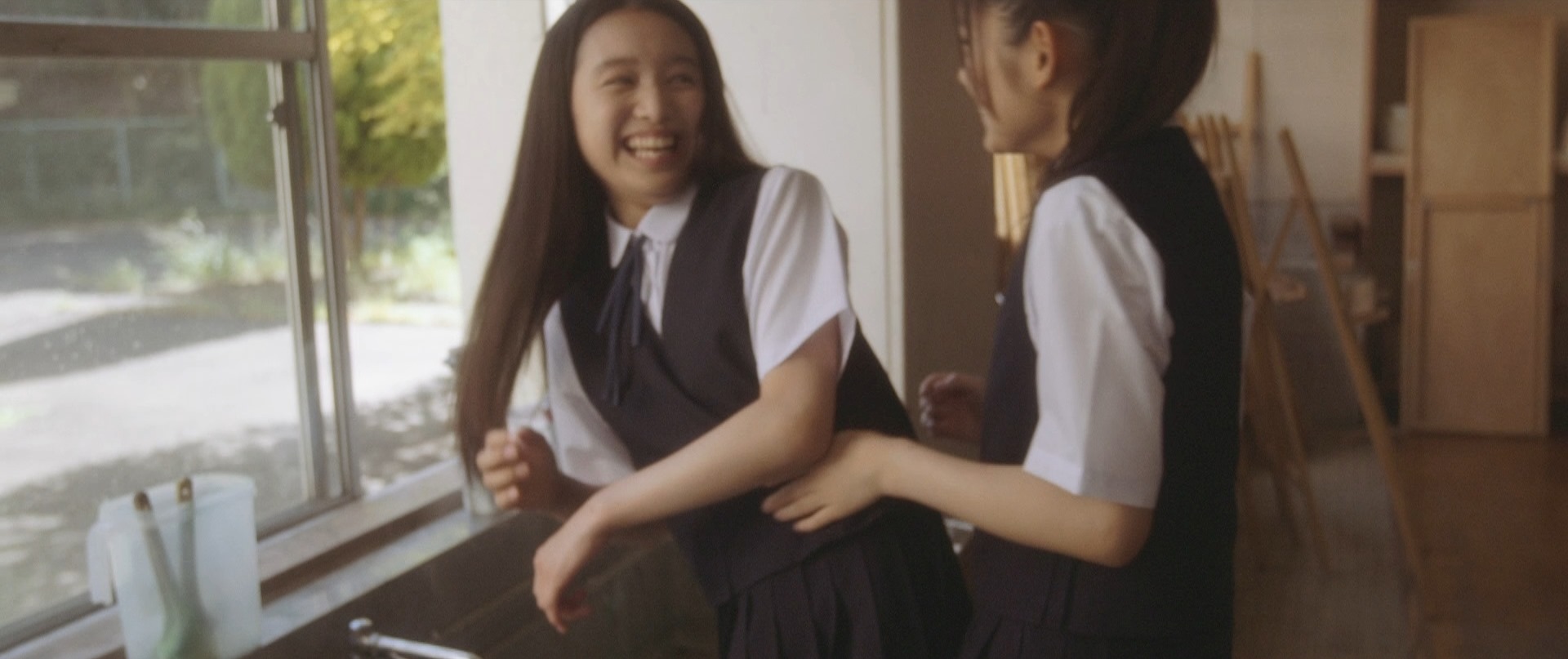 This might explain the desperation that takes over Takane. After they are done Mika helps Takane clean-up and as she washes Takane’s brushes, Takane suddenly hugs her from behind. She compliments Mika saying that she smells nice. Mika is sceptical since she was all sweaty. But Takane says that’s what she loves. Mika splashes water on Takane and the two start playing the chase game. Mika runs away as Takane chases her and then something happens.
