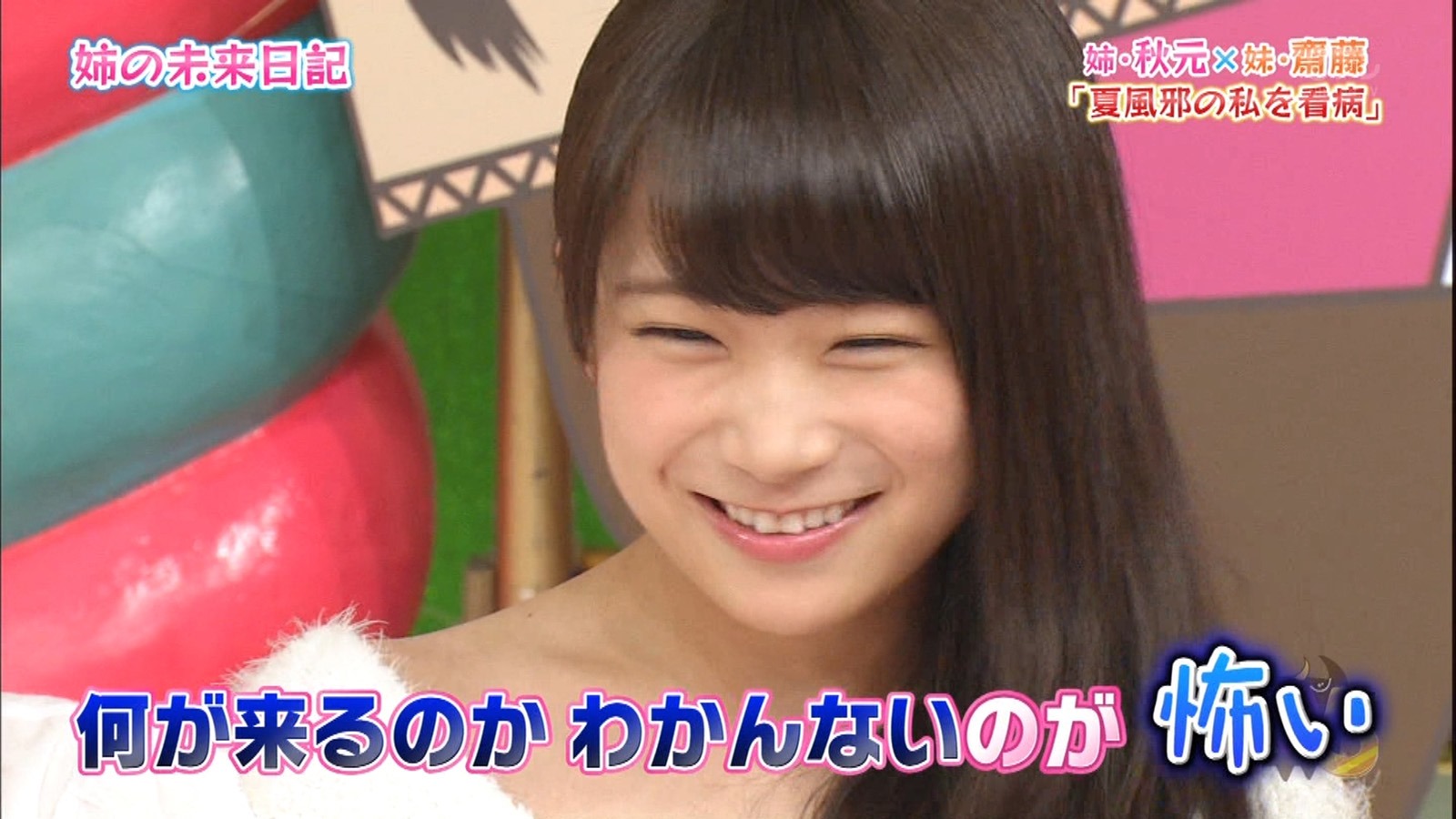 So when Hashimoto Oneechan read out to us what her sister would do next, MaiMai was in the same boat as us viewers. It was very fun seeing their reactions especially when they were asked to do some crazy stuff like in the case of the others. Hashimoto is a good girl of course so she wouldn’t make strange requests. But really, no one sane person could ask MaiMai of strange requests. Okay, maybe MisaMisa but they are on a different level of connection so…