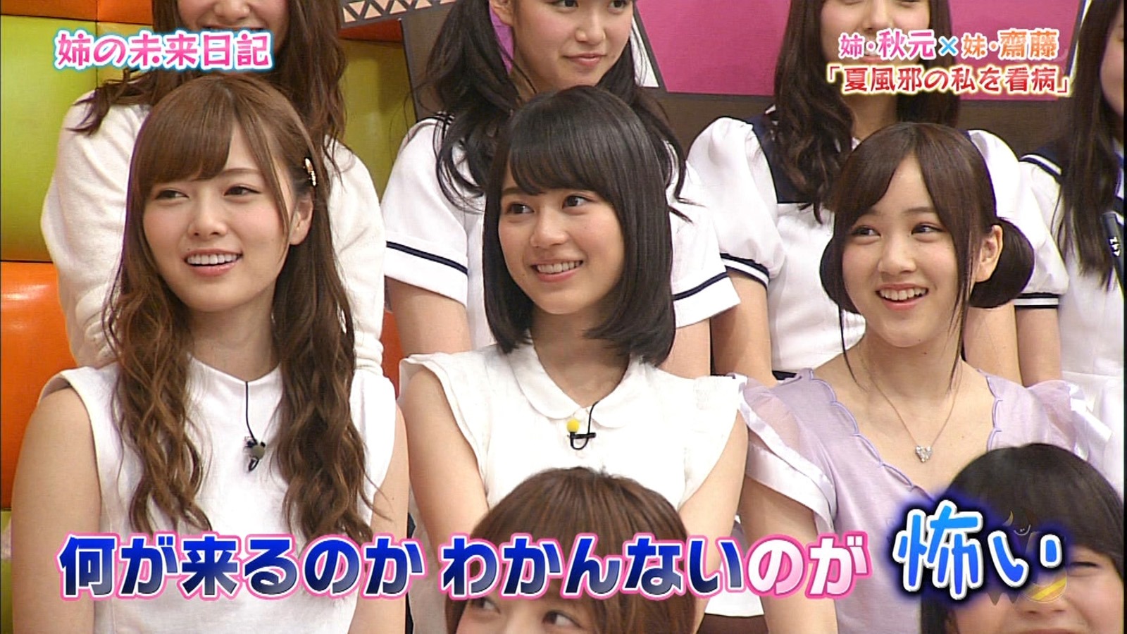 The next round is a threesome between Shiraishi Oneesama, Ikuchan and Kawaii, Kawaii Minami. Speaking of Minami, I just thought of something. What if this segment did not come out of nowhere? I am not sure how many remember but in one of the fantasies in earlier seasons, there was one with sisters and those sisters were Minami and Asuka. I have a feeling that this segment was derived from that one. And what way to make it better than have the receiver be another member instead of the camera?