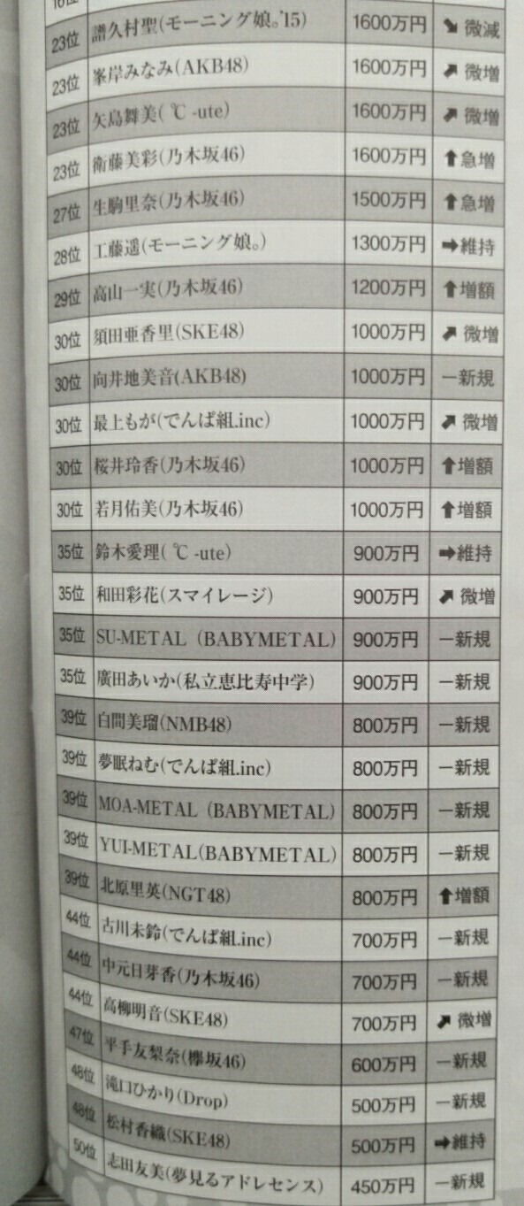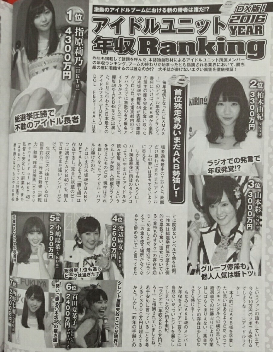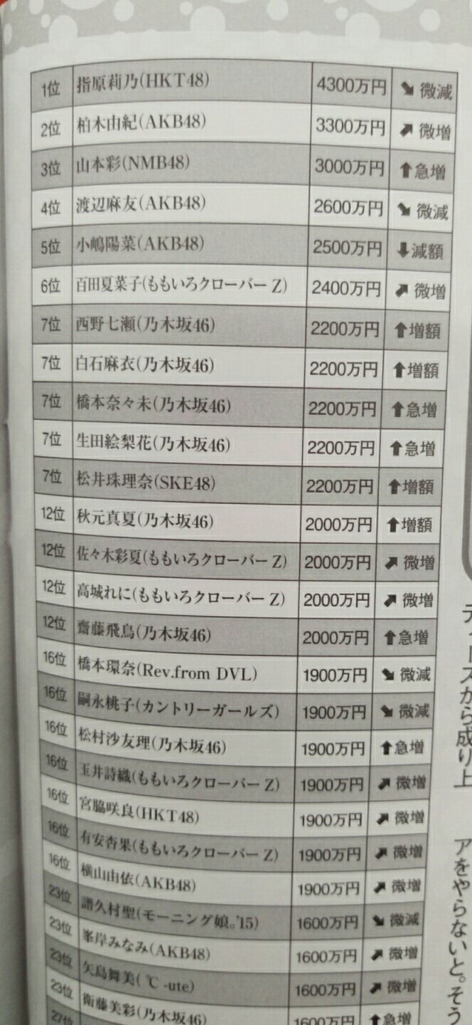 Anyway, saw this yesterday searching for some daily Yukirin bread and found it quite interesting, in more ways than one, like how low last year’s earnings were compared to 2014 where the 11th ranker (who was actually Matsui Rena), earned more than Sashiko did last year!