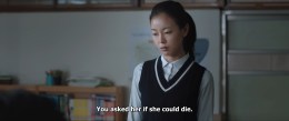 Seeing the way Kyeong-min’s family got affected after her death and the people she was close to makes one reconsider. Seeing the state in which Yeong-hee was in when she tried to kill herself by chugging down some chemical (bleach?) and seeing her bleeding from every pore of her body as her insides got melted to nothingness, that horrific scene makes one contemplating suicide reconsider! And the aftereffects of said attempt were another point to take to heart.