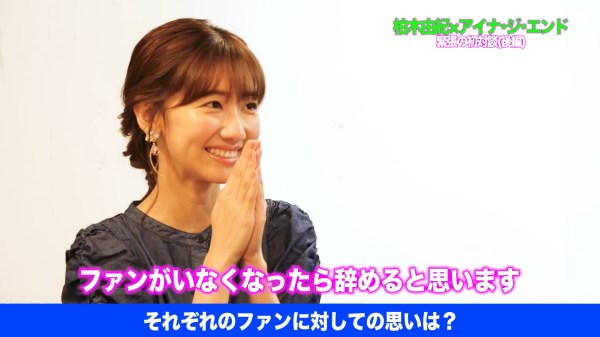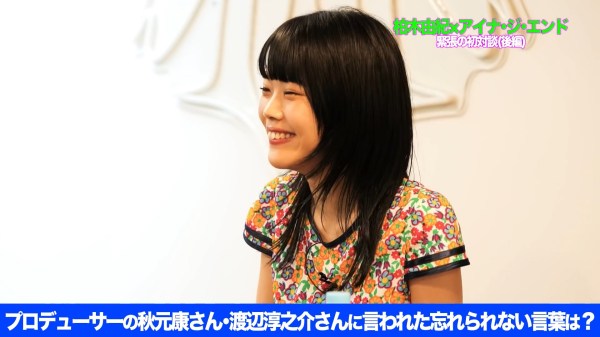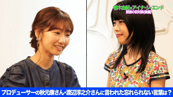 They then went on to talk about their fellow producers, in Yukirin’s case – Akimoto Yasushi, and in Aina’s case Watanabe Junnosuke. They are asked to talk about one thing their producers told them that they will never forget but sadly my Japanese failed me here a bit but from what I understood the advice that Yasusu gave Yukirin was meant for her young self not the current one but it had to do with respecting the Elders and being profession or something. Meanwhile Aina talked of how Watanabe-san never changes no matter the circumstance so she saw that as proof that he lived a truthful-to-oneself life and that is what she learned from him, to live her life without faces. Also she says that no matter what happens she knows he would never discard her so he seems to be very connected to the girls. Which I guess makes sense seeing as she runs the company by himself!