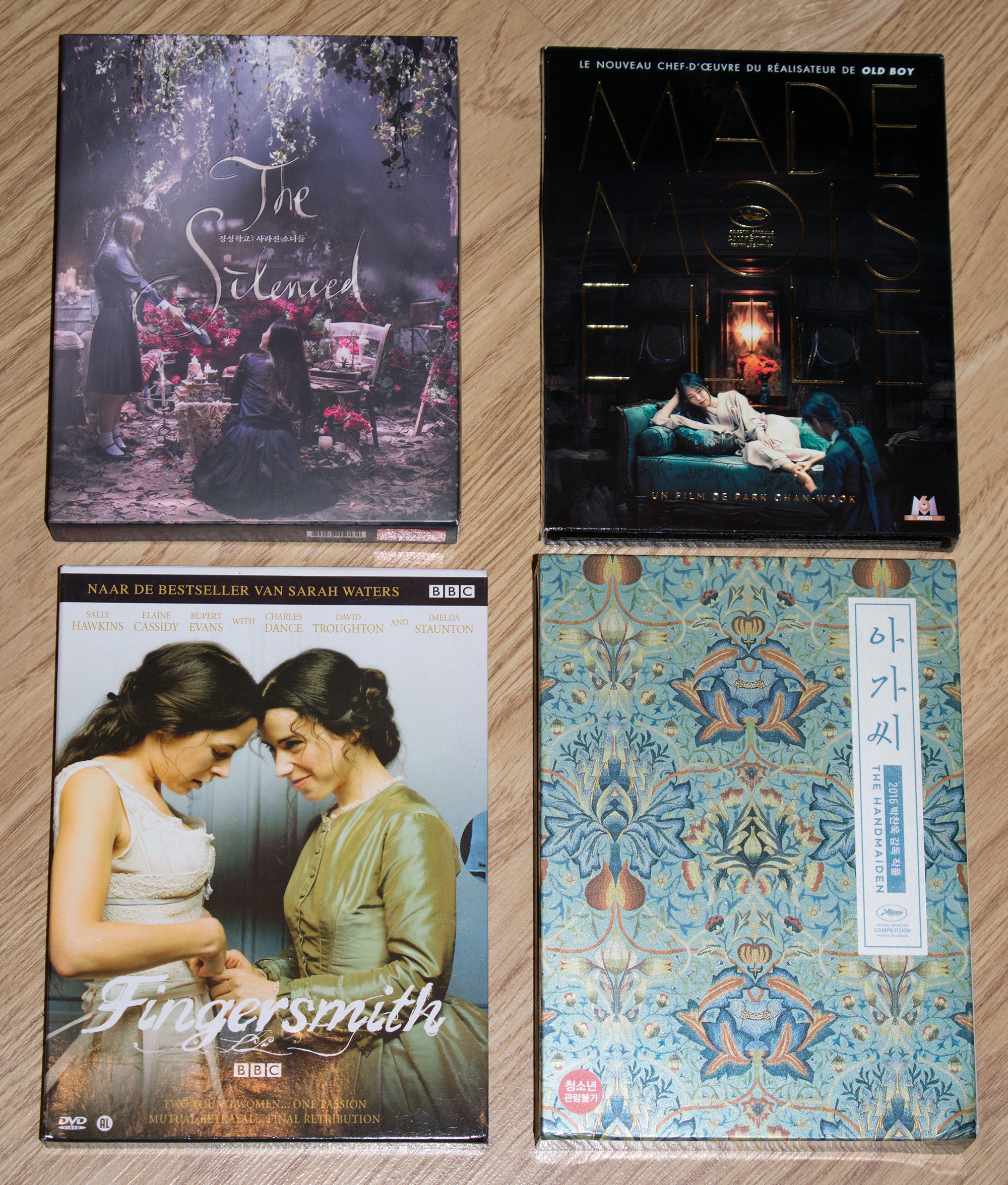 The collection includes my very first Plain Archive purchase The Silenced Blu-ray, The special 2disc French Handmaiden Blu-ray, the Korean 3Disc Handmaiden DVD, and the Netherlands 2Disc Fingersmith DVD. The Germany version of Handmaiden is on the way and the English version of the Special Extended Blu-ray coming in Aug is already on pre-order.